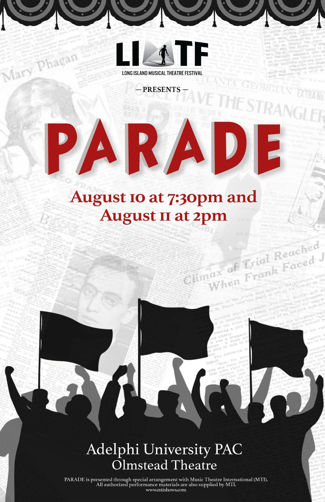 Amid religious intolerance, political injustice and racial tension, the stirring Tony Award-winning Parade explores the endurance of love and hope against all the odds. With a book by acclaimed playwright Alfred Uhry (Driving Miss Daisy) and a rousing, colorful and haunting score by Jason Robert Brown (Songs For a New World, The Last Five Years, Bridges of Madison County), Parade is a moving examination of the darkest corners of America's history.